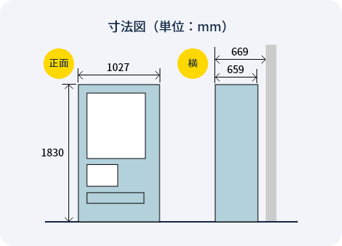 お店の前や駐車場などの空いてるスペースに置きやすいサイズになっています。最近では、サービスエリアや駅に配置したり、会社や学校の敷地内に配置することも増えています。