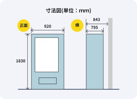 お店の前や駐車場などの空いてるスペースに置きやすいサイズになっています。最近では、サービスエリアや駅に配置したり、会社や学校の敷地内に配置することも増えています。