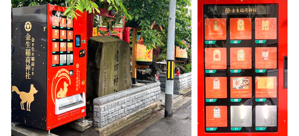そんな廣田神社の境内、金運を招福する銭洗い場や金箔金狐神像がある「金生稲荷神社」の横に、新しい授与所として自動販売機を利用した自動頒布機が設置されました。